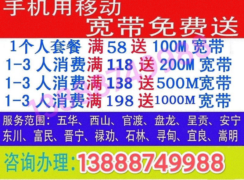 活动内容:昆明移动光纤宽带、网速可选100M、200M、500M、1000M、昆明移动新老用户都可以办理,更多优惠详情、可以直接联系我们哦!